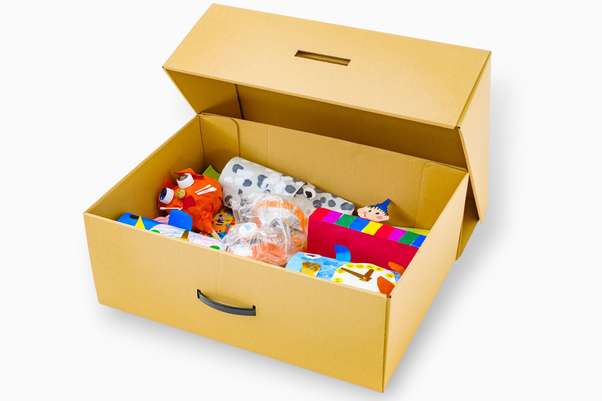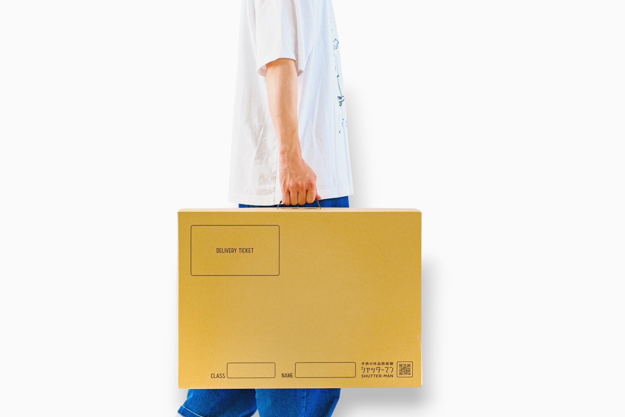 ダンボールに入れて送付いただいた分をすべてまるっと撮影し、画像化してお渡しします。数年単位で貯めていた作品やご兄弟分ダンボールに入るだけ詰め込んでください。ダンボールは、子ども作品の多くにみられるA2 サイズの画用紙もすっぽり収まる設計です。